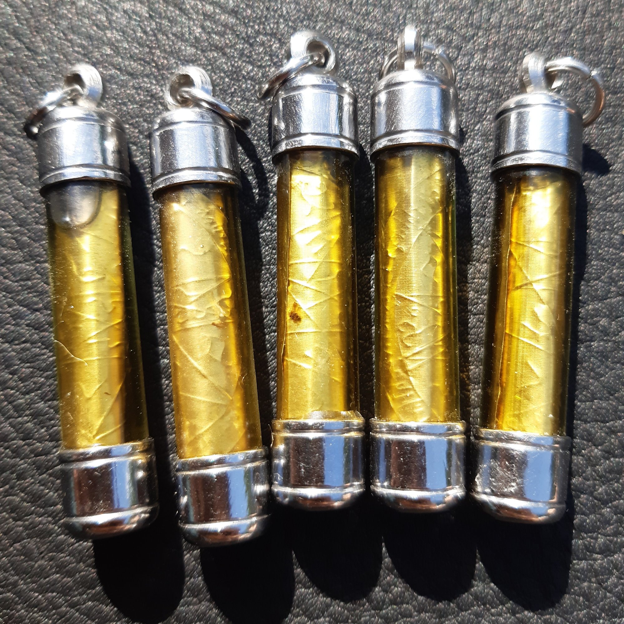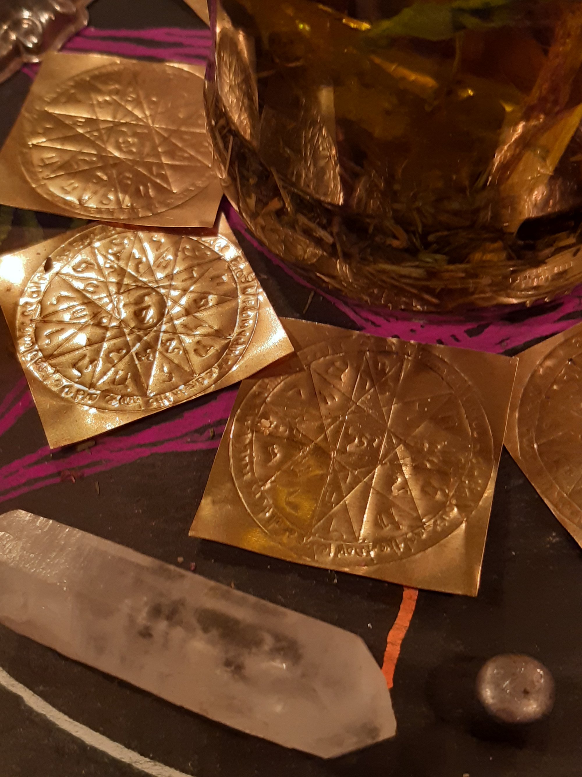 Inspired by Thai amulets which are often yantras carved in metal scrolls and floated in empowering oils, these are a Western conceptual homage to the amulets that inspired me to start making magical items in the first place. And they are potent!