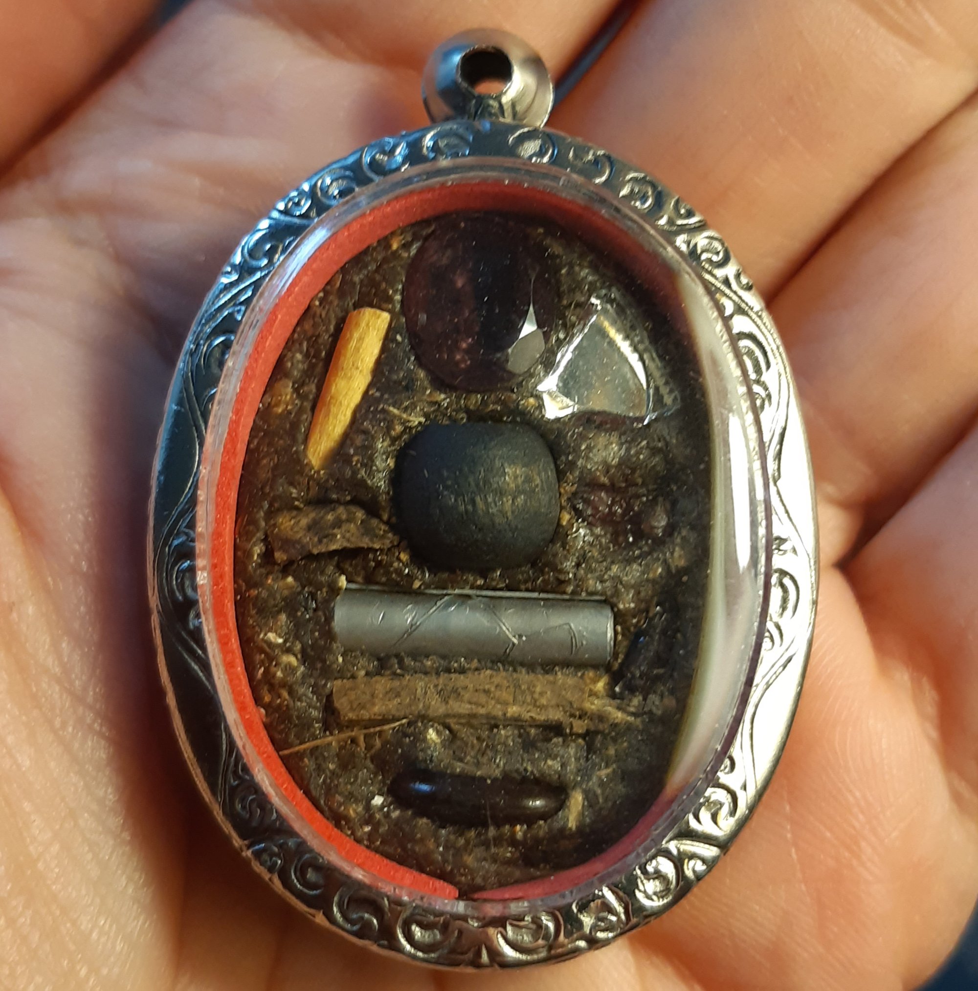 The materia includes soils from seven cemeteries and seven holy places, dirt from a crossroad, master root, acacia, rue, oak, wormwood, high John root, licorice root, galangal, devil’s shoestring, devil’s claw, lightning-struck wood, powdered shingle from a church roof (collected after renovation), blessed communion host, ashes left over from fire ceremonies, crushed rose quartz, carnelian, selenite, and black tourmaline. The back of each is fully loaded with chunks of high john, devil’s shoestring, master root, a fine cut amethyst cabachon, a piece of a ritually broken mirror for reflecting back anything malefic, blessed black rice from a magic school in Thailand for added protection, a spell scroll with a sigil of St. Cyprian and a sigil to imbue the amulet with all four elements and keep them flowing on one side, and a classic protection spell on the other, and one of Rev’s old and worn prayer beads to boost the power of the whole amulet. Three of these have an added Jindamanee ball in the back by LP Phrom of Wat Khao Or (the same school from which the blessed rice came) for extra good fortune and will go to the first three customers who order one. (First three are now sold)